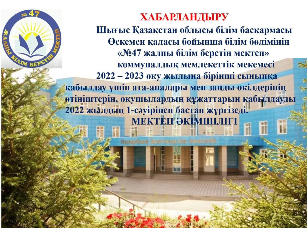 Хабарландыру » Шығыс Қазақстан облысы білім басқармасы Өскемен қаласы бойынша білім бөлімінің «№47 жалпы білім беретін мектеп» коммуналдық мемлекеттік мекемесі