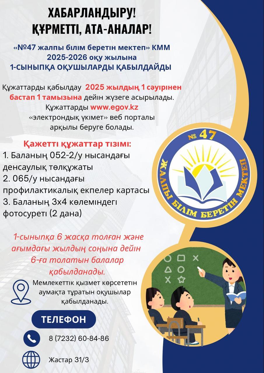 2025-2026 оқу жылына 1- сыныпқа оқушыларды қабылдайды » Шығыс Қазақстан облысы білім басқармасы Өскемен қаласы бойынша білім бөлімінің «№47 жалпы білім беретін мектеп» коммуналдық мемлекеттік мекемесі