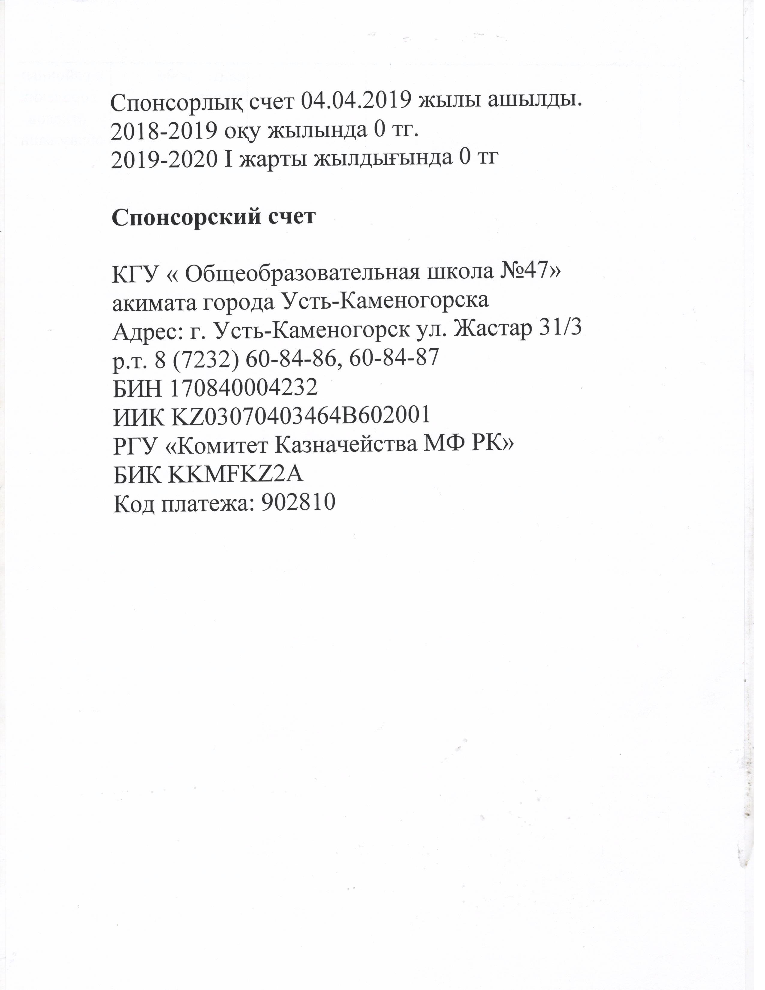 Спонсорлық счет » Шығыс Қазақстан облысы білім басқармасы Өскемен қаласы бойынша білім бөлімінің «№47 жалпы білім беретін мектеп» коммуналдық мемлекеттік мекемесі