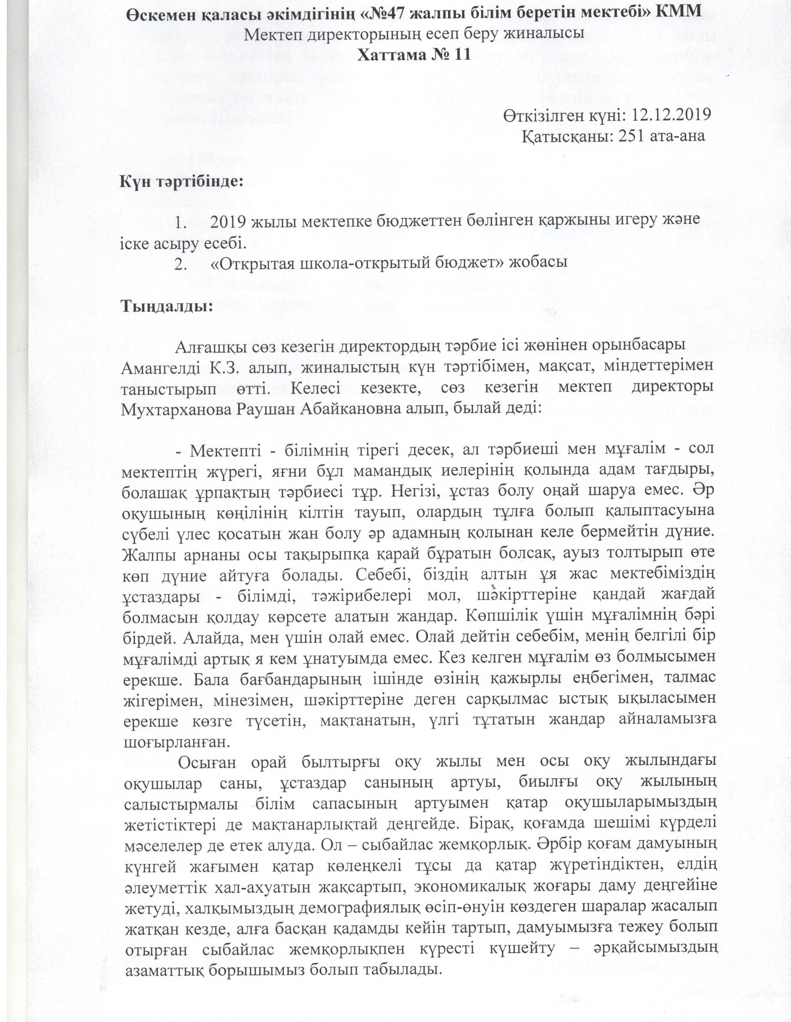 Мектеп директорының есеп беру жиналысы. Хаттама №11. » Шығыс Қазақстан облысы білім басқармасы Өскемен қаласы бойынша білім бөлімінің «№47 жалпы білім беретін мектеп» коммуналдық мемлекеттік мекемесі