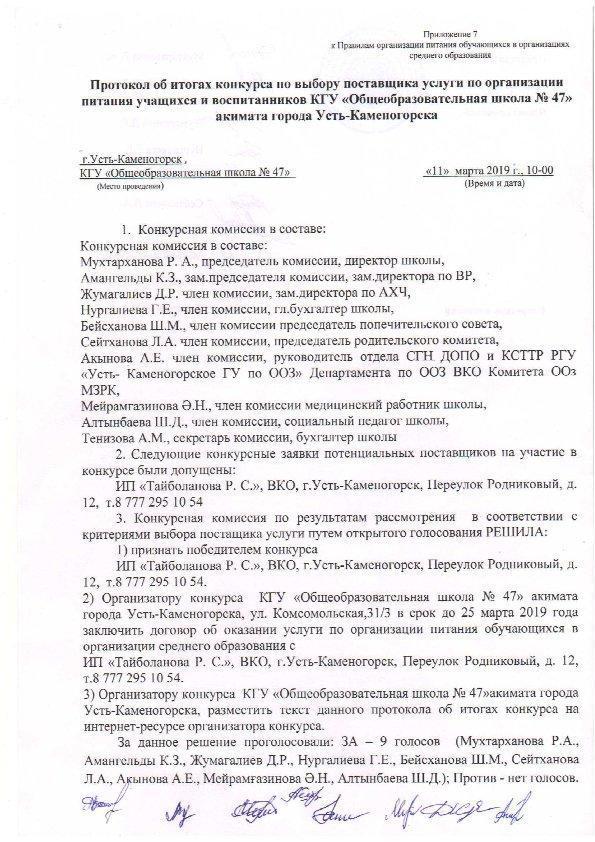 Протокол об итогах конкурса по выбору поставщика услуги по организации питания учащихся и воспитанников КГУ"Общеобразовательная школа №47" акимата города Усть-Каменогорска » Шығыс Қазақстан облысы білім басқармасы Өскемен қаласы бойынша білім бөлімінің «№47 жалпы білім беретін мектеп» коммуналдық мемлекеттік мекемесі
